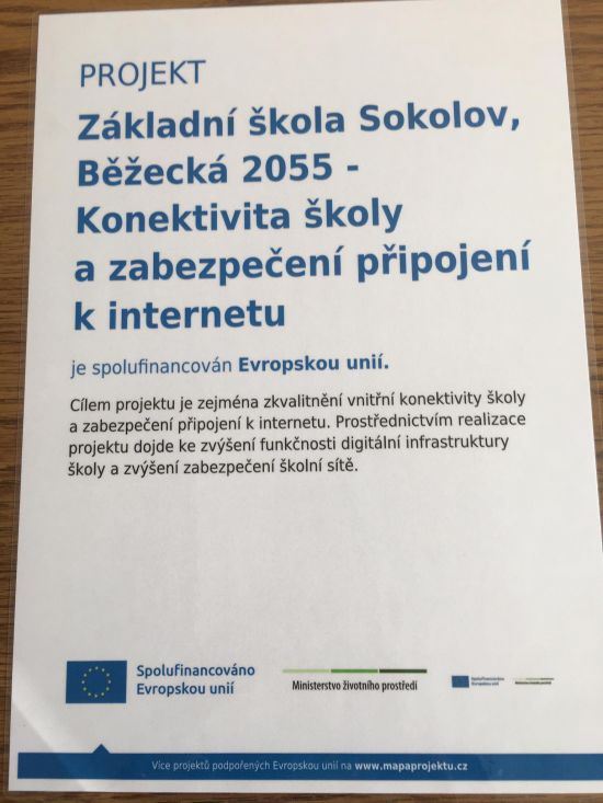 Škola je příjemcem dotace v rámci projektu "EU Peníze školám" - pracoviště Běžecká